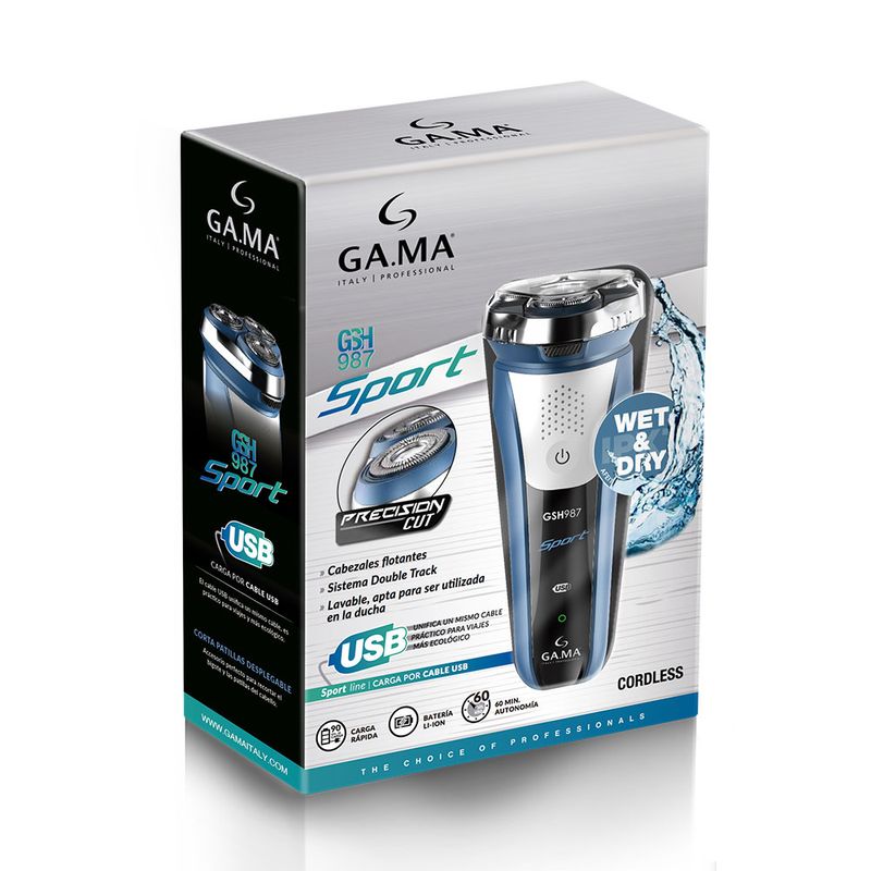 La AFEITADORA GSH987 SPORT USB se caracteriza por su corte de precisión ideal para el afeitado en seco y húmedo. Contiene cabezales con dos cuchillas rotativas y flotantes y un cortapatillas desplegable perfecto para recortar el bigote y patillas.