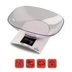 Balanza de cocina de plástico a batería, necesita 1 pila AAA. Contiene display digital y pesa hasta 3kg.