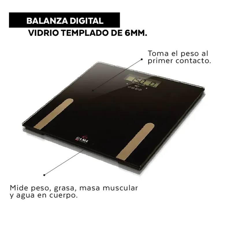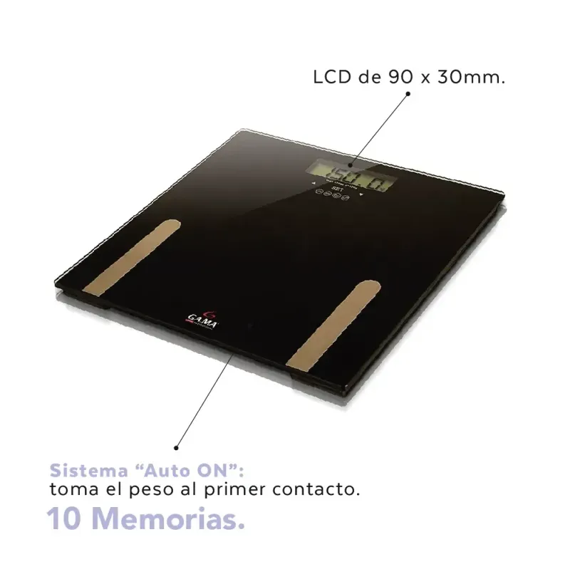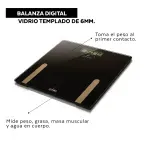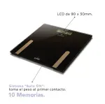 Balanza personal de vidrio templado de 6mm. Mide peso, grasa, masa muscular y agua en cuerpo. Toma el peso al primer contacto. Maneja la información de hasta 10 usuarios simultáneamente.