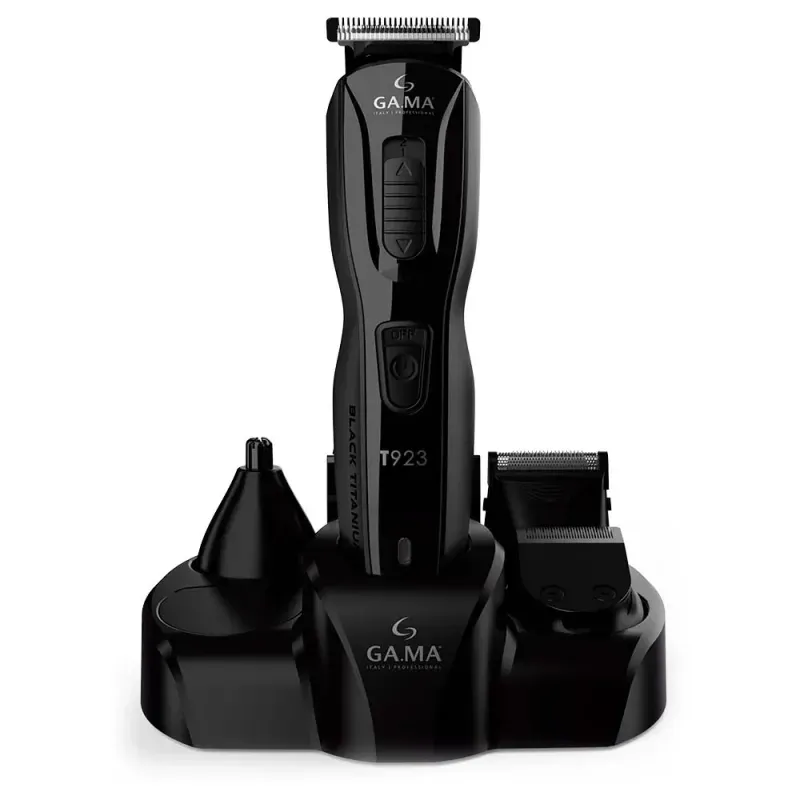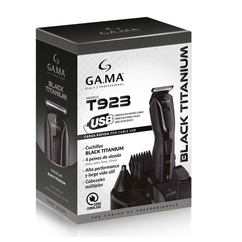 Cortadora GAMA t923 black titanium con autonomía de 50 minutos y un tiempo de carga de 7hs. Incluye 4 peines de alzada de 3,6,9y12mm, ajuste de cuchilla fija. Se puede utilizar como afeitadora,clipper, trimmer y nose.